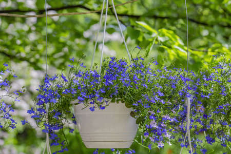 Flower lobelia erinus (edging lobelia, garden lobelia or trailing lobelia) in white pot bracket outdoors in garden