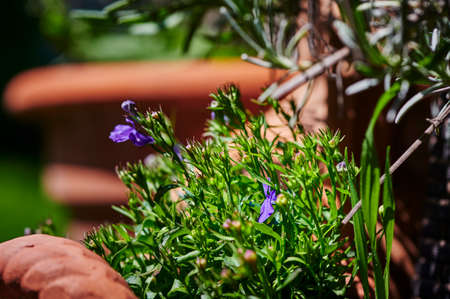 Blue lobelia flowers grow in pot in small garden on the balcony.