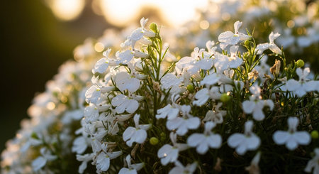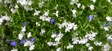 Panoramic floral banner with blooming white and blue lobelia, seasonal summer garden texture, fresh decorative background, eco friendly floral design, natural foliage, banner frame, wide format