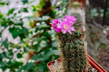 Blooming cactus in pot. Delicate pink cactus flowers bloom on prickly cactus, showing off its sharp spines. Blurred background.