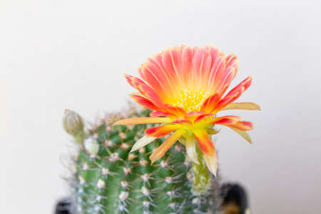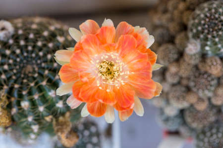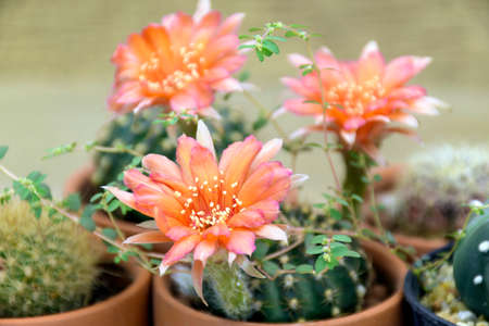 Lobivia spp. with orange flowers on blurred background. Tiny pot of cactus Lobivia marmalade with beautiful flowers.