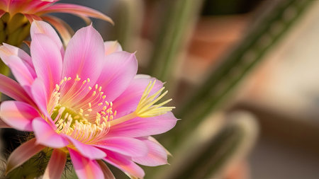 AI Generated. Beautiful Cactus Flower Blooming in Natural Sunlight Background