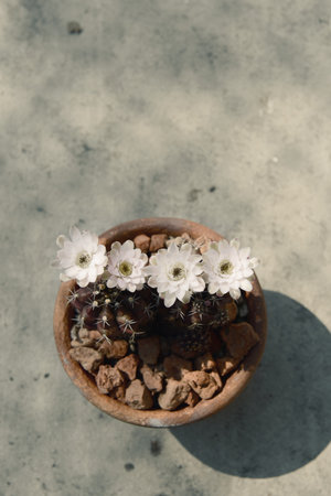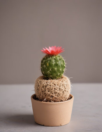 A Gymnocalycium cactus in a pot sprouts a delicate pink and white flower against a blurred grey background.