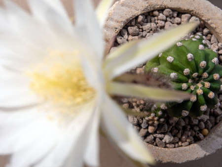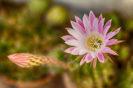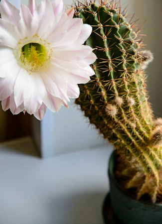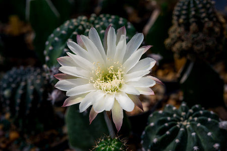 Close up shot of a beautiful Cactus flower - Echinopsis oxigona. Concept of how to make cactus to bloom