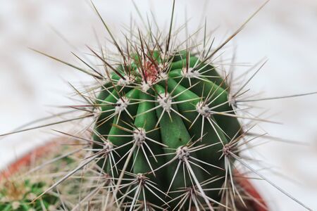 Close-up of the top of an exotic green prickly cactus with a blurred background.