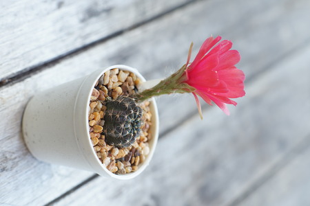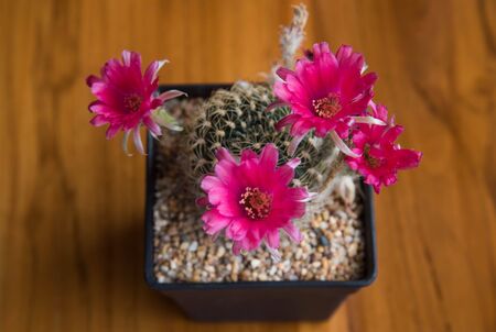 Variety of cactus and succulent concepts. Pink flower of cactus blooming and growing in the pot on a wooden shelf in a shop. Small plant for home or office.