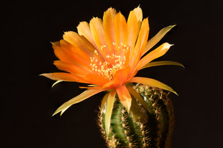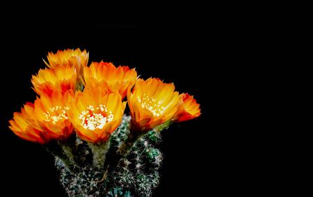 Orange flowers on mini cactus name Lobivia. little pot on isolated black background. Studio shot and lighting