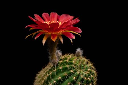 Echinocereus - bright crimson or red cactus flower on a black background in a botanical garden