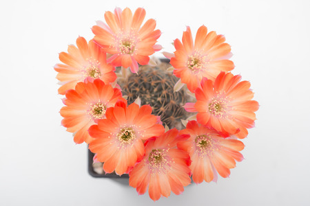 Orange and yellow flowers of Lobivia hybrid in closed-up as flowers background.