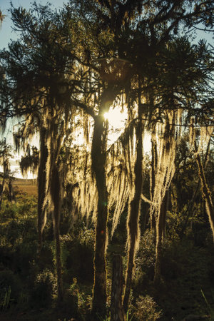 Tree branches covered by lichen and epiphytes with sunlight passing through amid grove near Cambara do Sul. A small country town in southern Brazil with amazing natural tourist attractions.