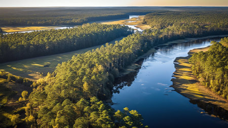 Aerial view of the ocean and coastal road in Bogue Sound, North Carolina, during sunset. The beach is visible on one side, with sand dunes leading to calm waters. In front stands an endless line of green forest stretching into the horizon. A straight highway runs along the right edge. It's a serene scene captured from above by a drone, offering a panoramic perspective of the tranquil coastline. --chaos 30 --ar 16:9 --quality 2 --stylize 500 --v 6.1 Job ID: 2efb8768-dfd6-4c8d-82ab-99a7e8c02cdf