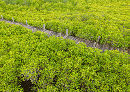 Impressive Aerial View of Empty Wooden Boardwalk among the Spurred Mangrove Forest in Rayong Province of Thailand