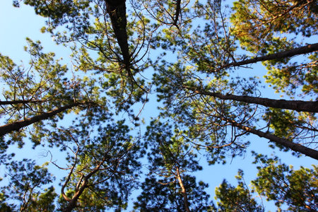 Bottom view of tall conifer trees in young bright pine forest.