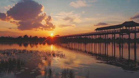 This captivating image showcases a stunning sunset over tranquil waters, featuring a wooden bridge silhouetted against the colorful sky. Perfect for nature lovers.