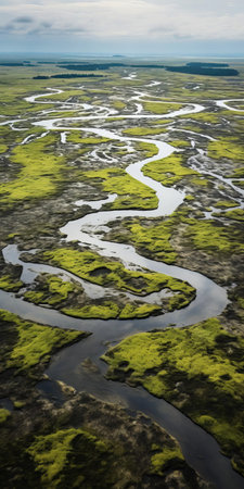 aerial view of a marshland and river, rendered in cinema4d, showcasing dark green and light cyan tones. this narrative-driven visual storytelling captures the essence of dutch marine scenes. the lomography lady grey film effect adds a unique touch to the rendered image, while the use of unreal engine creates layered and atmospheric landscapes. ai generated