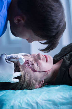 Survey radiography of the skull of a man. A doctor radiologist is studying an x-ray examination. A snapshot of the skull is placed on the patient’s head.