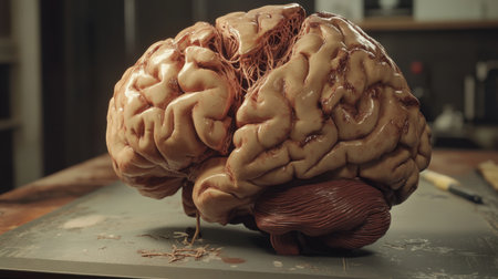 A highly detailed and realistic human brain model displayed on a table. This image highlights the intricate anatomy, perfect for educational and scientific purposes.