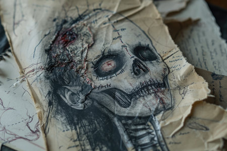 A skull drawing on a piece of paper, showing intricate details and bold lines, A detailed sketch of stitched wounds, AI Generated
