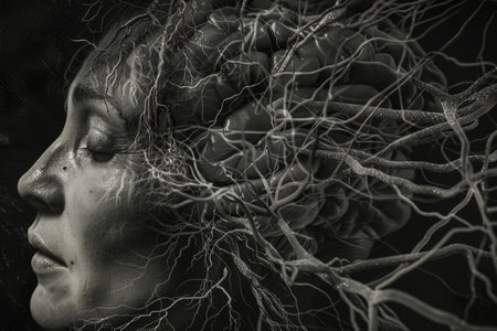 Conceptual illustration of a woman s head integrating nature and technology, symbolizing the harmony between biology and digital connections, with vibrant colors on a dark background