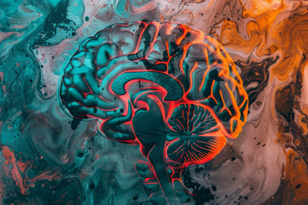 A detailed brain glowing with orange neural connections, set against a dark, abstract background.