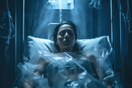 A woman with a serious illness rests in a medical facility, covered with a protective blue dot plastic sheet, symbolizing the harsh realities of fighting the coronavirus