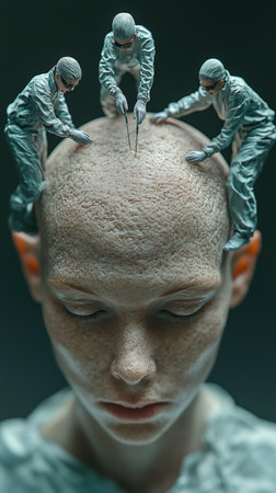 A surreal depiction of three tiny doctors conducting a hair implantation on a human scalp, showing their detailed surgical technique and professionalism.