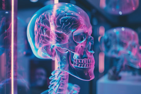 Transparent human head model with brain structure in dark room, concept for neurology research.