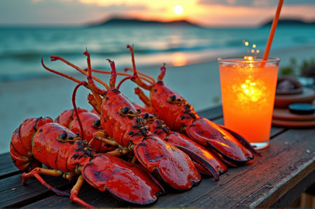 That the image is generated using AI. Fresh grilled lobsters with bright cocktail on beachside sunset.