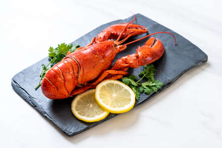 Seafood feast, Lemon and fresh Boston lobster on the ice