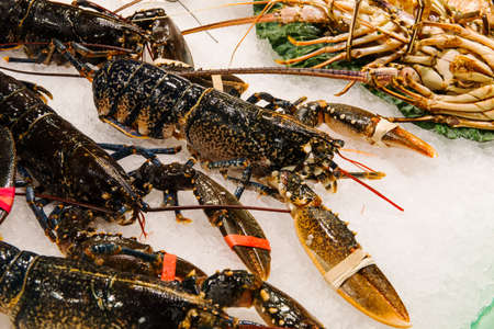 Freshly cooked lobster on sale at a fishmonger market stall in London, UK, selective focus.