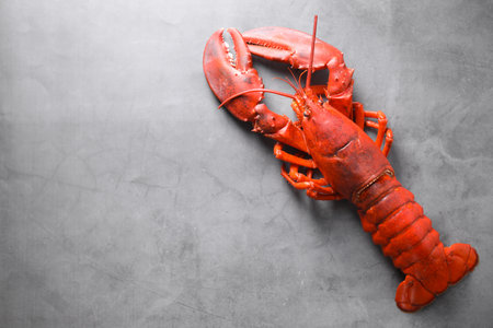 A whole cooked red lobster is presented against a neutral background, showcasing its shell and claws. This image represents gourmet seafood dining and high-quality culinary ingredients.