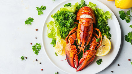 Fresh spiny lobster served on a white plate with lemon, coriander, parsley, and a side of lettuce salad. The top view captures the elegance and appetizing presentation of this seafood dish.