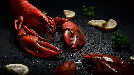 Red lobster with lemon and parsley studio shot high contrast dark mood.