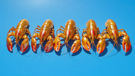 A striking arrangement of vibrant red lobsters showcases their unique textures and details. The bright blue surface adds contrast, enhancing the visual appeal of this food composition.
