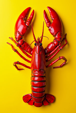 A brilliantly colored lobster rests against a cheerful yellow background, highlighting its striking red shell and detailed claws, evoking a sense of fresh seafood delight.