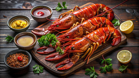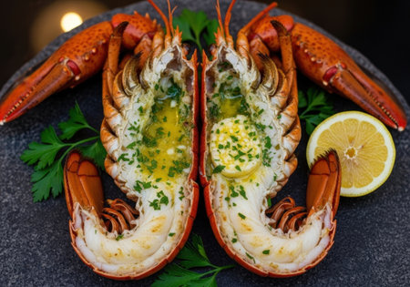 A close-up shot of a beautifully grilled lobster, known as , glazed with garlic butter and garnished with fresh herbs, served on a vibrant plate with lemon wedges.