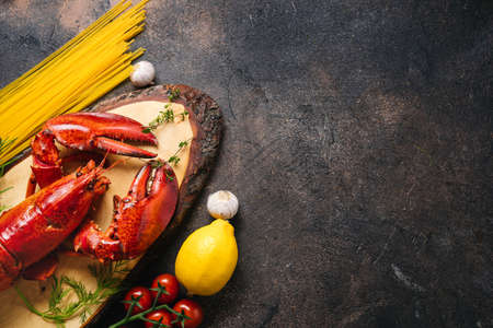 Top view of prepared lobster, spaghetti and vegetables on dark background. Copy space. Gourmet food for holidays