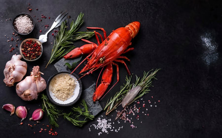 Vibrant seafood display with raw lobsters on ice, on a black stone table, viewed from the top