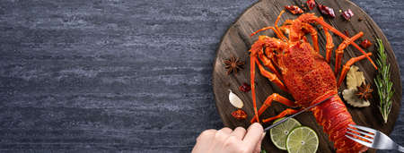 Gourmet holidays food, Cooked red lobster and pasta on dark background, Banner with copy space.