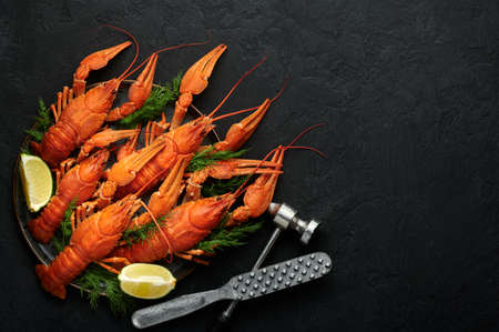 Boiled Crayfish on black plate on dark slate table top. Red crawfish with green dill and lime is a popular party dish. Copy space. Top view