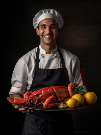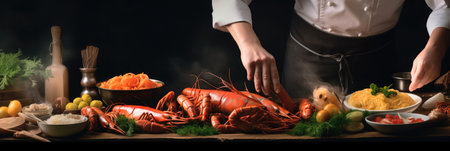 The Chef prepares a large Lobster with other delicacies. Seafood delicacies. Photos for the menu of a cafe, restaurant