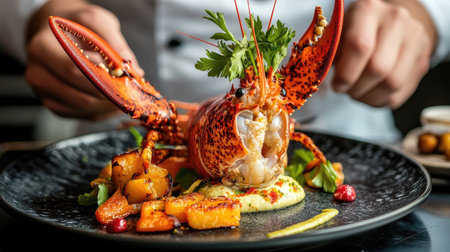 A stunning arrangement of a freshly cooked lobster placed on a stylish plate, complemented by vibrant vegetables and delicate herbs. Perfect for gourmet presentations.