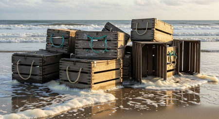 Stack of traditional lobster traps on coastal waterfront, used for capture fisheries and seafood collection, with ocean in background
