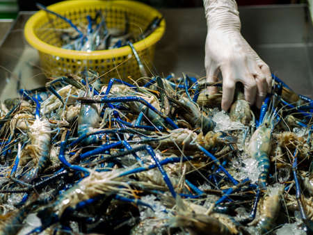 giant freshwater prawn In a fresh market, traders are putting them in baskets to assess prices