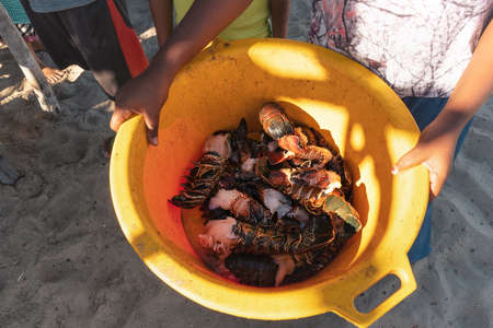 Local woman showing yellow plastic bowl with freshly caught crustacean seafood - crabs, langostino and lobster. Fishing is one of main sources of food in Madagascar
