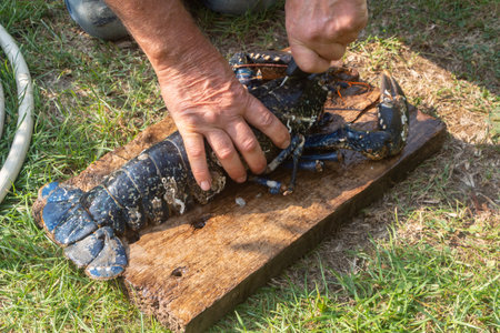 Fisherman cutting a breton lobster after fishing it in Brittany