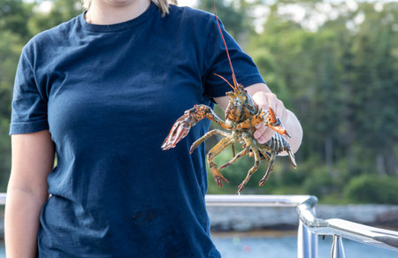 Live Lobster haul and demonstration on a boat in Boothbay Harbor Maine on a summer day