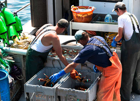 Freshly caught lobster being sorted by lobstermen on a fishing boat in Maine.
