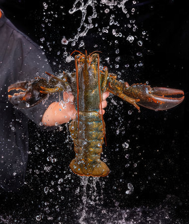 Close up food photo of a raw seafood lobster at the farmers market stall