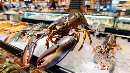 A stunning arrangement of fresh lobsters displayed in a modern seafood market, showcasing vibrant colors and textures that invite culinary exploration.